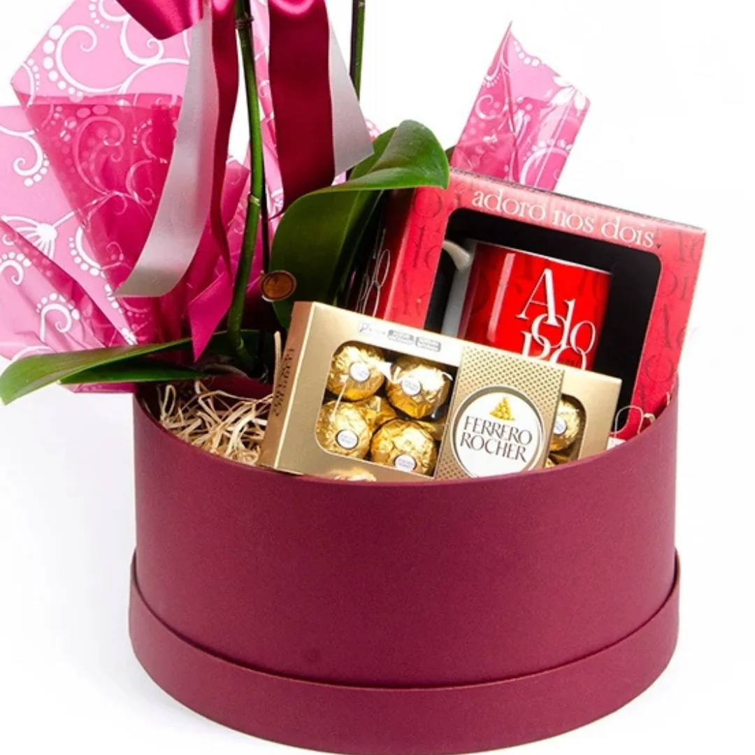 Box Requinte Luxo com orquídea Marcelo Almeida, uma caneca personalizada e uma caixa de bombons Ferrero Rocher (8 unidades).