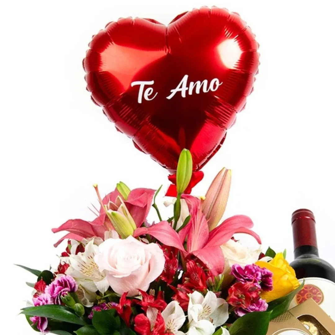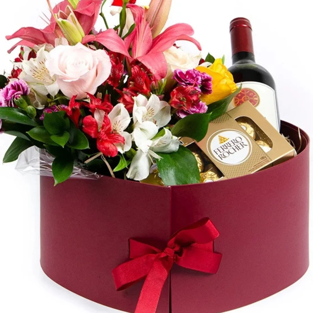 Box Requinte Personalizado com arranjo de flores nobres, vinho importado, uma caixa de bombons Ferrero Rocher (8 unidades) e um balloon mensagem personalizada.
