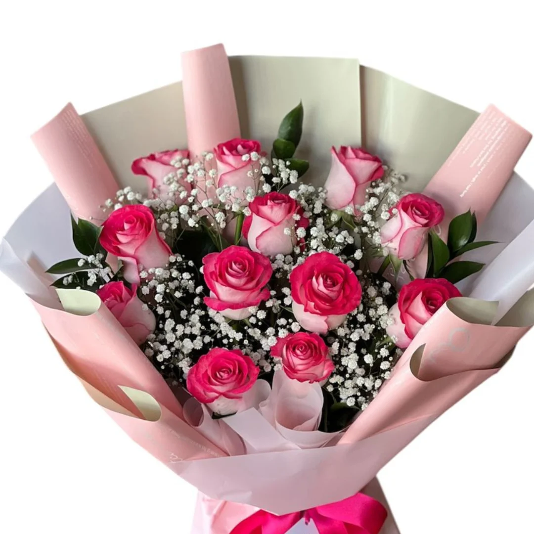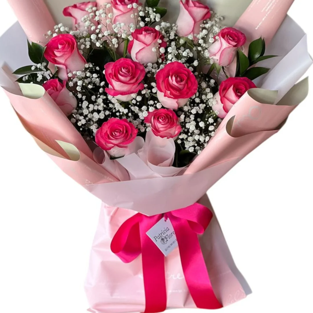 Linha premium montado com 12 rosas cor de rosa , gypsofila e ruscos
