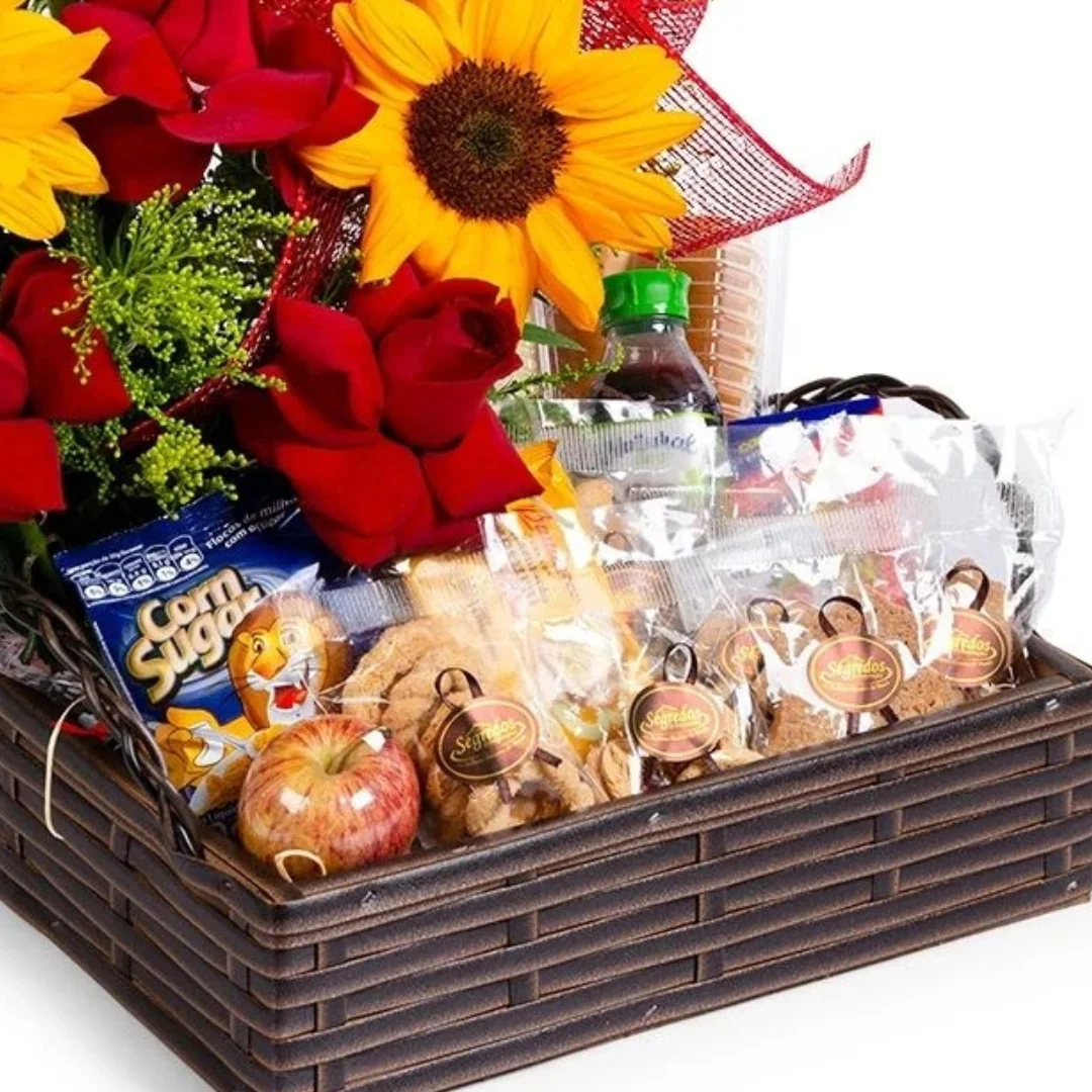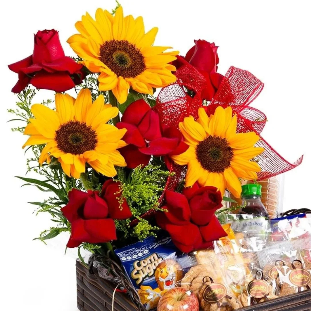Acompanha um lindo arranjo com 6 rosas abertas e 3 girassóis.