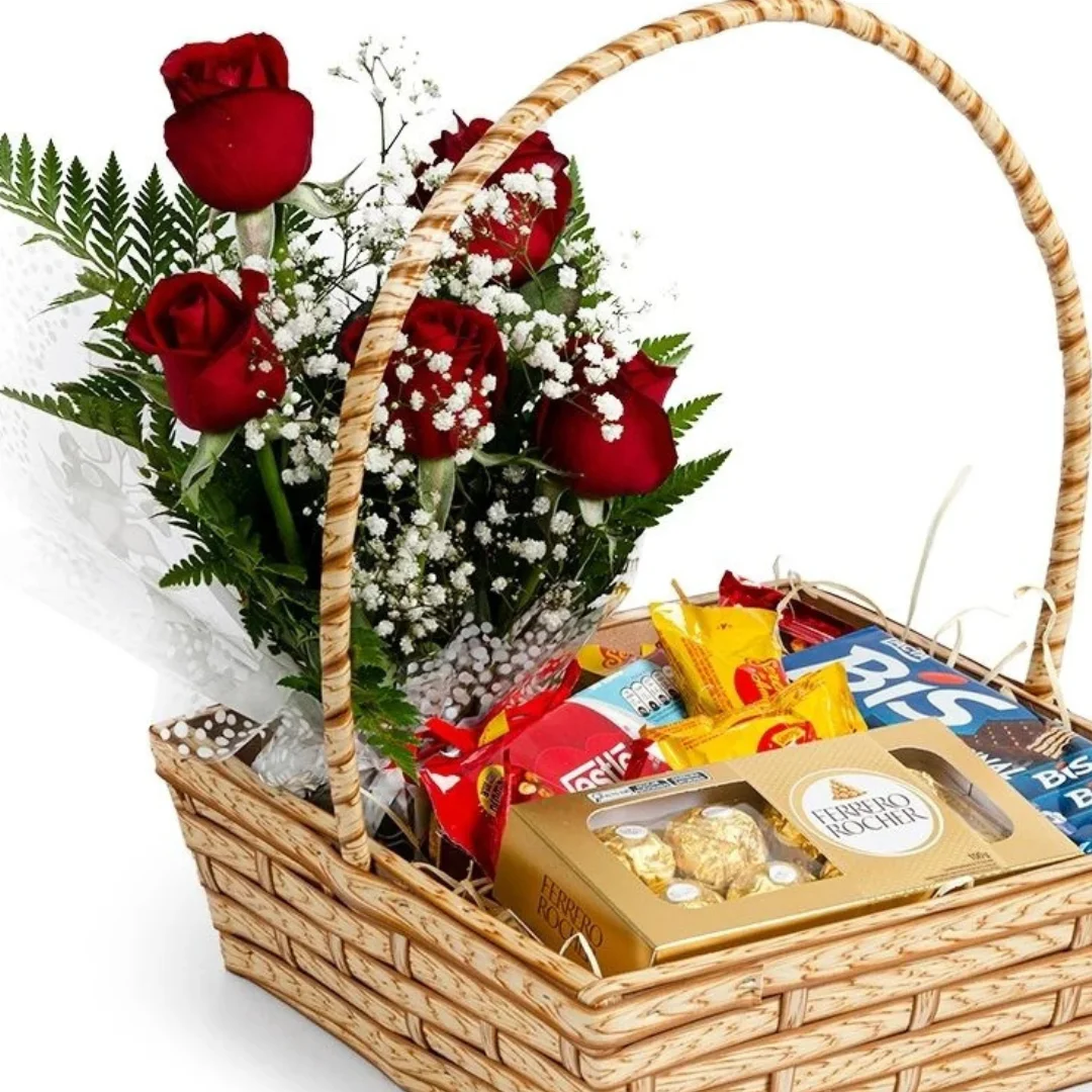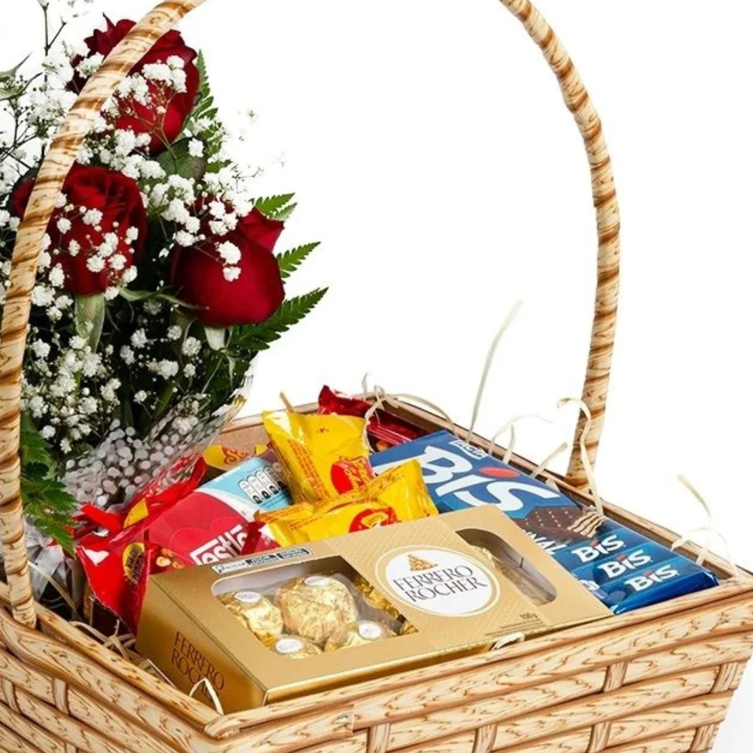 Cesta de chocolates. Material da cesta: fibra sintética.