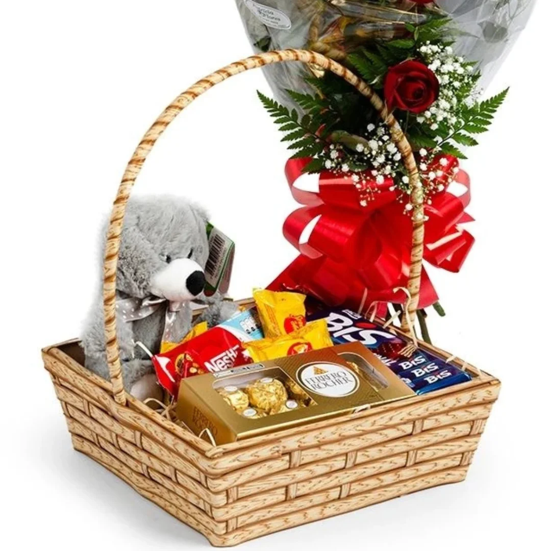 Cesta de chocolates. Material da cesta: fibra sintética.