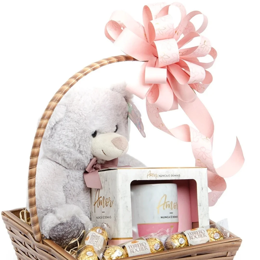 Acompanha um urso de pelúcia com aproximadamente 28 cm.