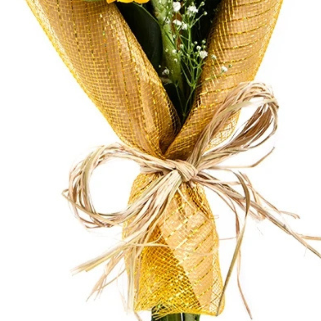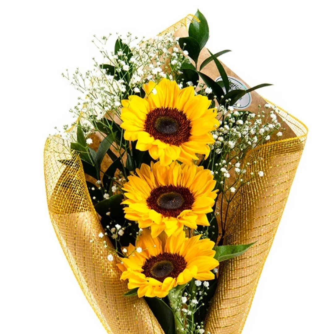 Buquê de girassol (3 unidades) e ruscus.