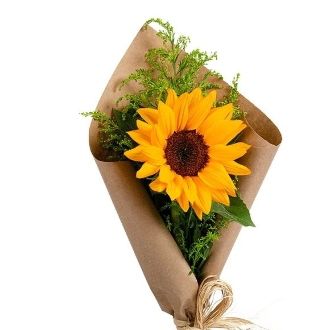 Girassol embalado em papel Kraft e laço de rafia.