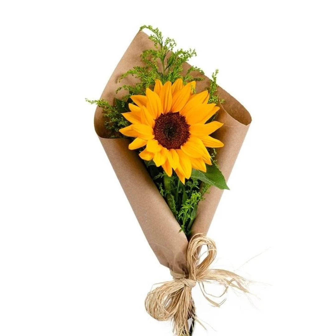 Girassol embalado em papel Kraft e laço de rafia.