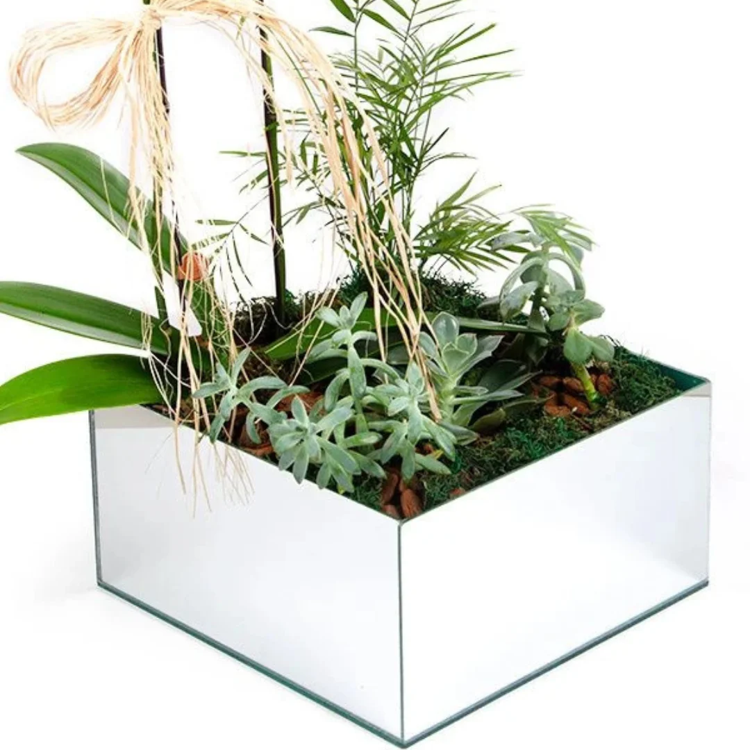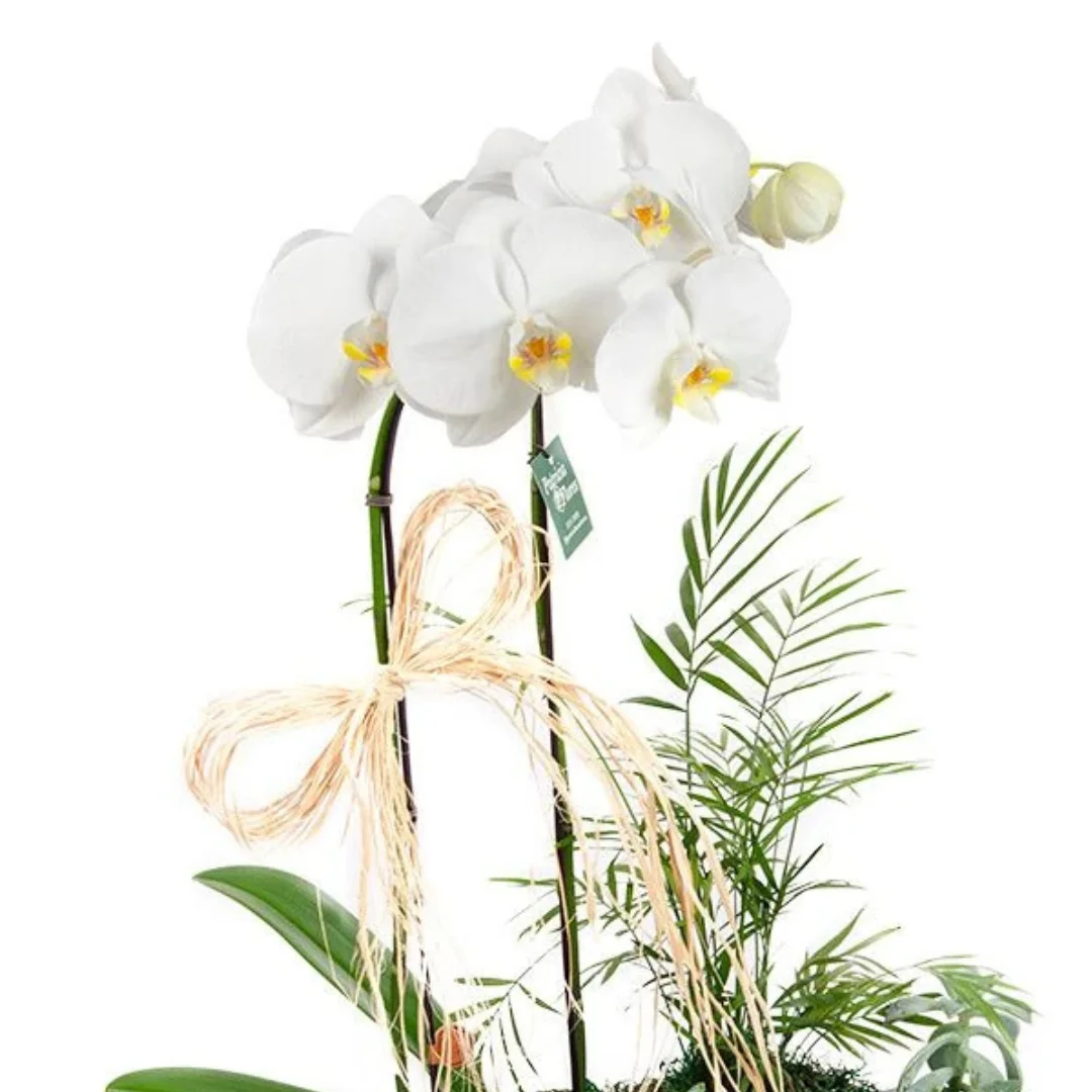 Vaso de orquídea phalaenopsis Marcelo Almeida embalada em cachepot espelhado, laço de ráfia e montagem de vegetativo com plantas simulando um jardim.