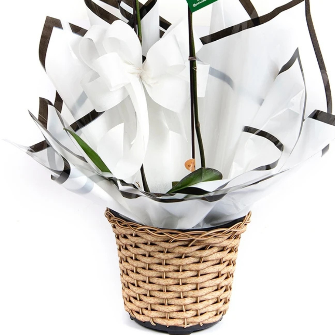 Vaso de orquídea phalaenopsis embalada em cachepot de fibra sintética e laço em tnt.